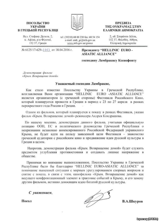 "На нашу думку, демонстрація цього фільму, враховуючи офіційну позицію ООН, ЄС і політичного керівництва Грецької Республіки щодо невизнання незаконно анексованого Російською Федерацією українського Криму, не йтиме на користь заявленій меті фестивалю – знайомству грецької аудиторії з російським кіно і просування ідеї російської культури в Греції в цілому. Навпаки, це стане предметом поглиблення протистояння і створить зайву напруженість у суспільстві", - йдеться у листі.