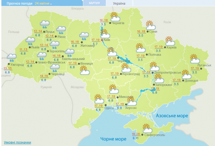 25 квітня у західній та південній частині Українb дощі, місцями грози, вітер переважно південно-східний, у західних областях північно-західний, 5-10 м/с.