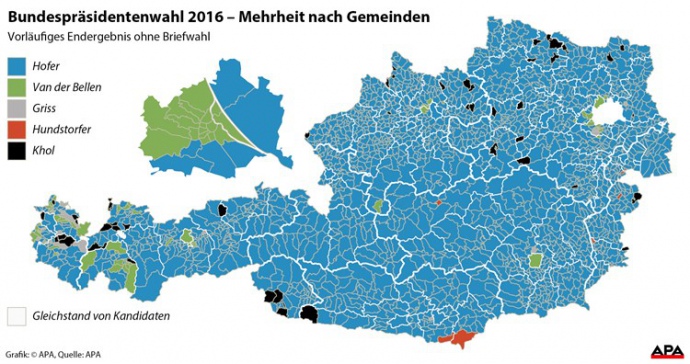 В карті на сайті МВС зазначено, що кандидат від націоналістичної "Партії свободи" Норберт Хофер переміг в усіх землях Австрії, за винятком Відня.