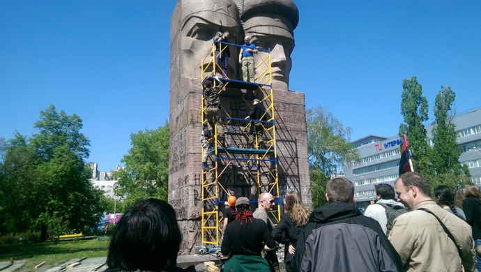 Наразі біля пам’ятника зібралися близько сотні людей. До монументу підставили будівельні ліси. Четверо людей намагаються його знести, зокрема по монументу б'ють молотом, свердлять дірки перфоратором.