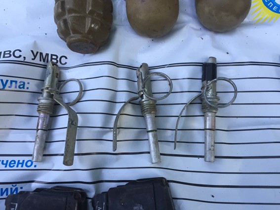 Працівники поліції та військової контррозвідки СБУ вилучили поліетиленові пакети, в яких знаходилися одна граната Ф1, дві гранати РГД-5, три запали, два магазини до автомату Калашникова та 350 патронів калібру 5,45.