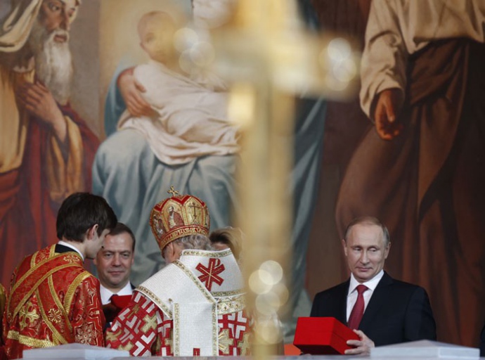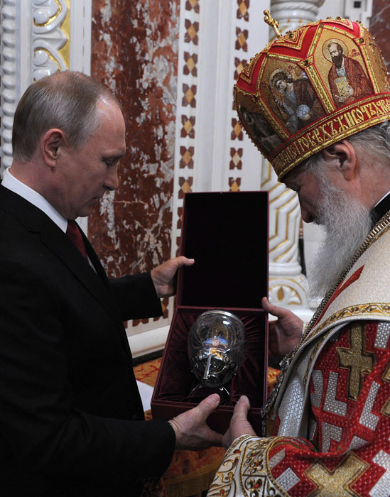 Патріарх Московський і всієї Русі Кирил під час пасхального богослужіння у храмі Христа Спасителя подарував президенту РФ Володимиру Путіну і прем'єр-міністру Дмитру Медведєву ювелірні великодні яйця.