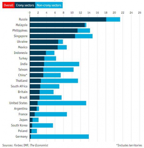 Складаючи рейтинг видання використовувало дані щодо станів і джерел доходів найбагатших людей світу зі списку мільярдерів Forbes.Перша п'ятірка рейтингу виглядає наступним чином: Росія, Малайзія, Філіппіни, Сінгапур і Україна.