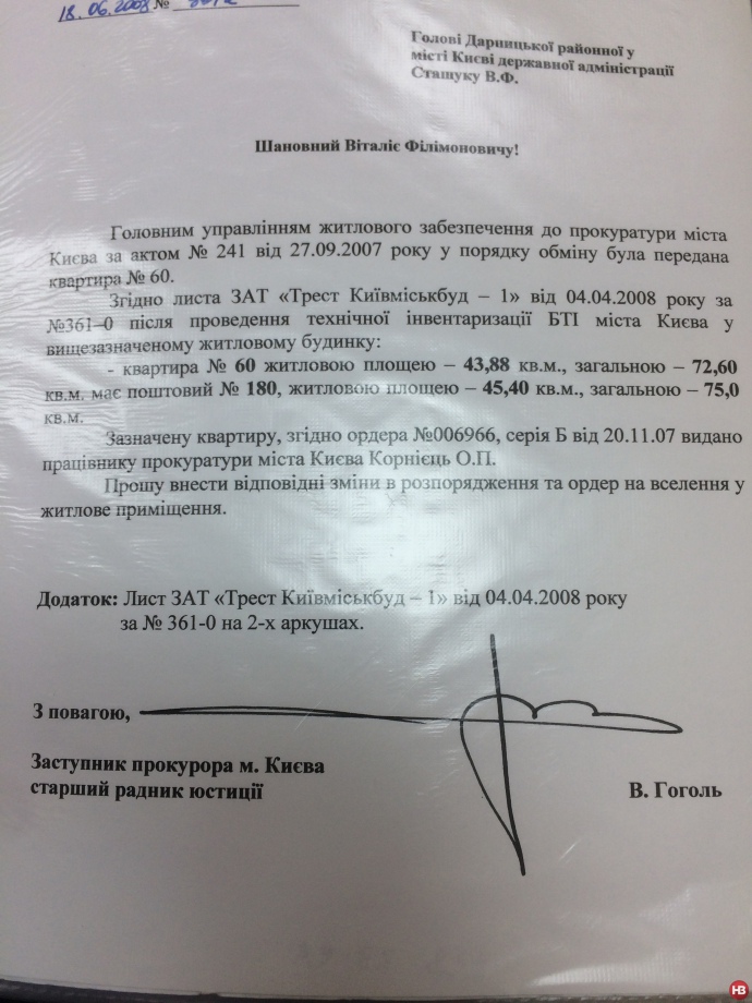 Екс-заступник прокурора Київської області Олександр Корнієць з 2007 року отримав як мінімум дві службові квартири, а також земельну ділянку біля аеропорту Жуляни, на якій він зводить будівлю вартістю понад $400 тис.