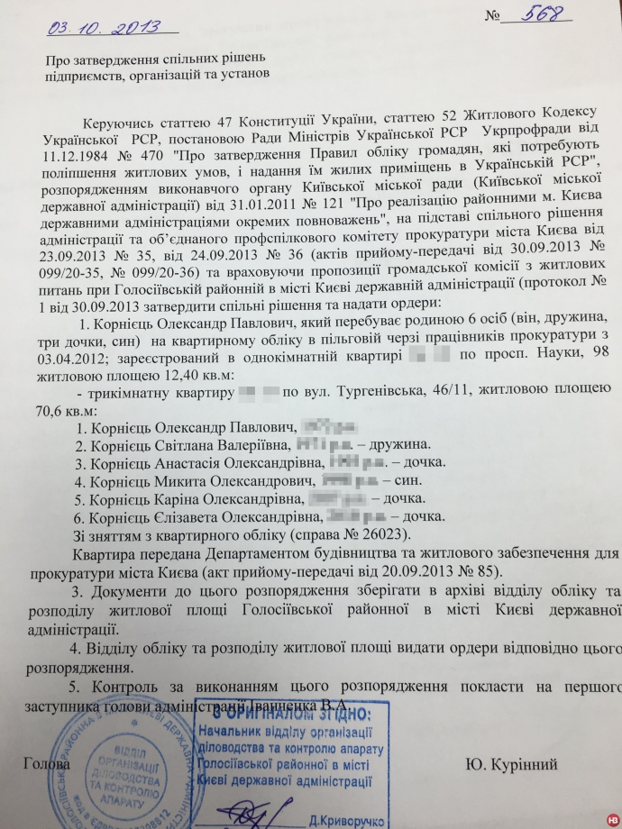 Згідно з документами, першу квартиру площею 70 кв. м Корнієць отримав в 2007 році після клопотання прокуратури Києва до профільного управління КМДА. На той момент у Корнійця вже була одна двокімнатна квартира, яку йому виділили раніше, але сім'я з трьома дітьми в ній поміщалася погано.