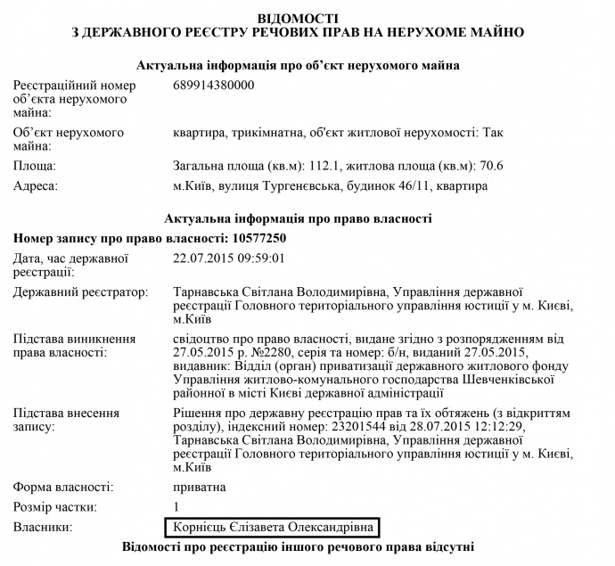 Після свого арешту в початку липня 2015 року Корнієць переоформив цю квартиру на 5-річну доньку, перебуваючи при цьому в СІЗО. Таким чином йому вдалося уникнути арешту квартири, у той час як інше його майно було заарештоване.
