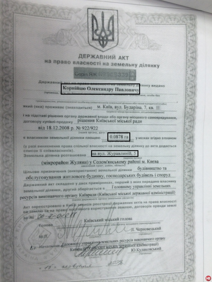 Крім квартир, Корнієць у 2008 році отримав від київської влади земельну ділянку біля аеропорту Жуляни, на якому зараз будується великий будинок, хоча сам ділянка заарештована.