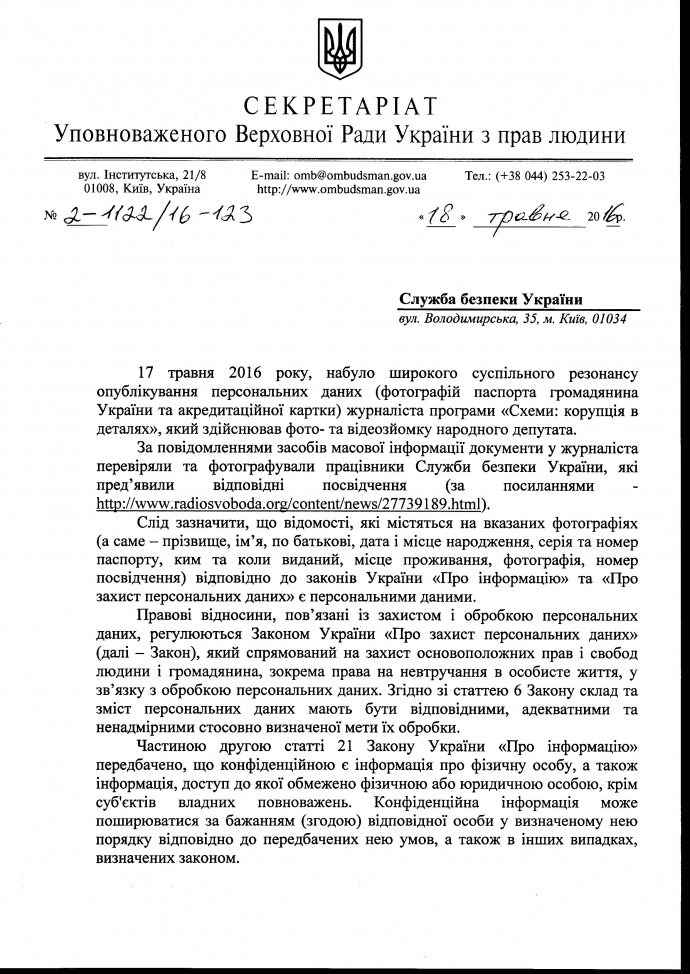 "Гарантії, закладені в статтях 32 та 34 Конституції України, в окремих випадках створюють конфлікт між двома основоположними правами людини – правом на приватність та правом на інформацію", – зазначає омбудсмен у листі до СБУ.