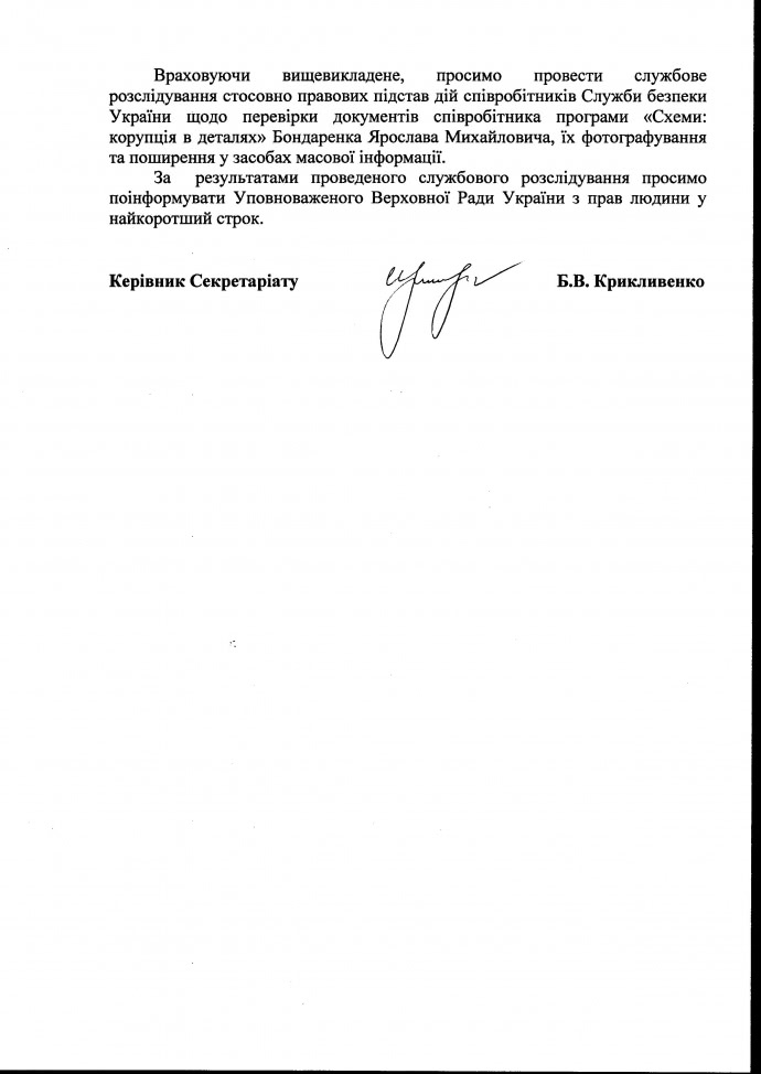 Лутковська пропонує керівництву СБУ провести службове розслідування стосовно правових підстав дій співробітників Служби безпеки України щодо перевірки документів співробітника програми "Схеми: корупція в деталях", їх фотографування та поширення у засобах масової інформації.