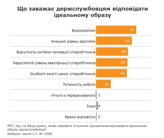 "Найчастіше, більшість опитаних називає бюрократизм держслужби, як головний чинник "не ідеальності" державної служби. 63% вважають, що перешкодою є низькі зарплати держслужбовців, 56% вказали, що причина - у відсутності системи мотивації (програм навчання, кар’єрного росту) працівників", - сказано в прес-релізі.