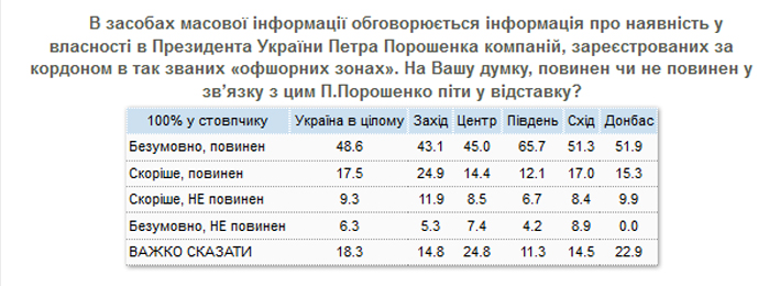 Більша частина українців вважають, що президент Петро Порошенко має піти у відставку в зв'язку з інформацією про наявність у нього офшорів.