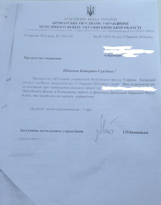 "У листі за підписом заступника начальника управління Броварського об'єднаного управління Пенсійного фонду України в Київській області І.А. Іваницької йдеться: "Пенсійний фонд України у Київській області надає Вам ксерокопію повідомлення про відновлення виплати пенсії у Київському районі м.Донецька "Донецької Народної Республіки", яке надійшло до нашого управління", - вказано у документі.