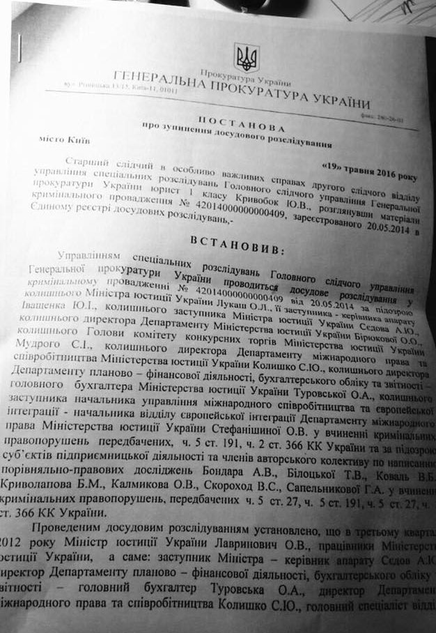 Вона також привела першу і останню сторінки постанови старшого слідчого Київської прокуратури з особливо важливих справ Кривобока Ю.В.