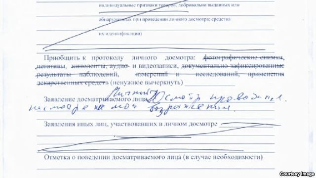Він додав, що після допиту отримав від російських силовиків Акт проведення особистого огляду, у якому вказав, що "особистий огляд було проведено попри його заперечення".