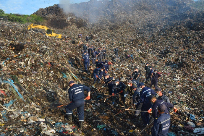 На території полігону твердих побутових відходів тривають пошуково-рятувальні роботи після того, як троє рятувальників опинилися під завалами сміття.