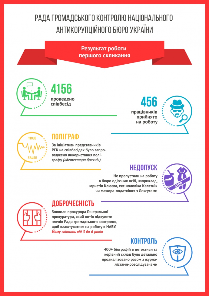 Рада громадського контролю, зокрема займається підбором детективів до НАБУ. Вона формується у складі 15 осіб, відібраних за результатами конкурсу.