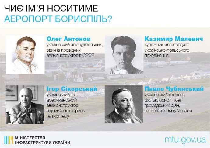 За підсумками наради, за словами Омеляна, визначилися, що Міжнародний аеропорт Бориспіль може носити ім'я: Ігоря Сікорського, Казимира Малевича, Олега Антонова або Павла Чубинського.