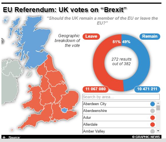 Однак розрив між прибічниками та противниками виходу вкрай малий. 51% (9 млн 940 тис) проголосували за те, щоби Британія вийшла з ЄС, 49% (9 млн 402 тис) – проти цього.