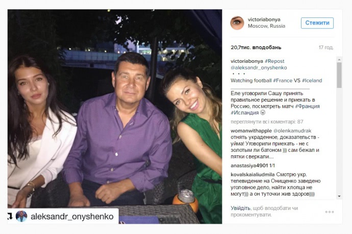 Праворуч від Онищенка Вікторія Боня - російська телеведуча, модель и колишня учасниця реаліті-шоу "Дім-2". Зліва від українського нардепа Софія Никитчук - переможниця конкурсу краси "Міс Росія-2015".