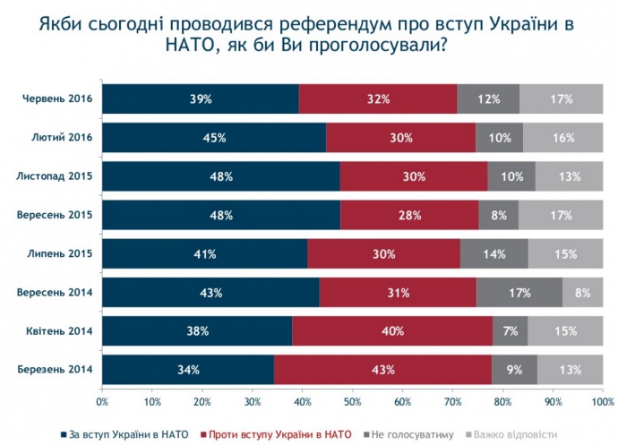Зазначимо, що у лютому 2016 року, згідно інформації "Рейтингу", підтримати рішення про вступ України в НАТО були готові 45% українців.