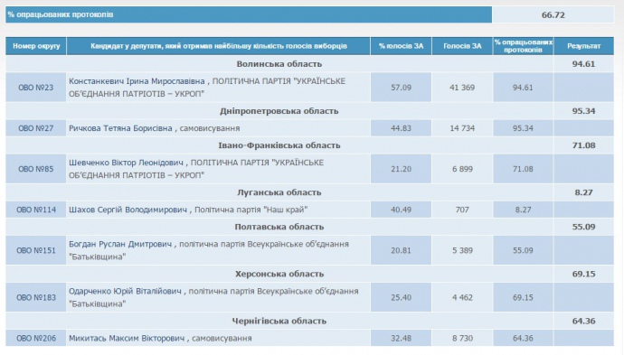 Як відомо, станом на 13.27 ЦВК опрацювала 66,72 протоколів на проміжних виборах до Верховної Ради в 7 округах.