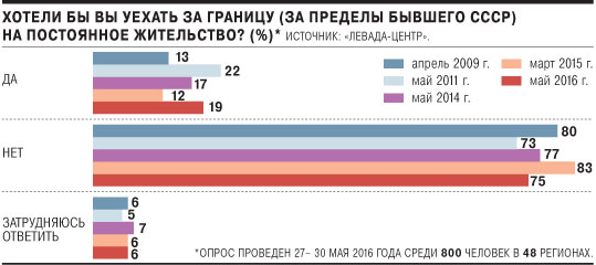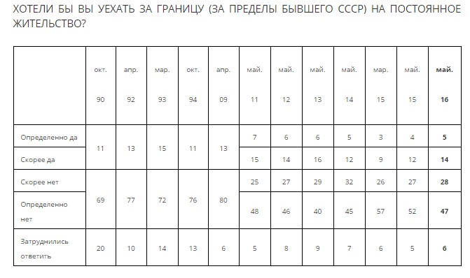 Як зазначає Левада-центр, еміграційні настрої росіян суттєво за рік не змінилися: частка респондентів, які заявляють про своє бажання виїхати, складає майже п'яту частину опитаних - 19%.