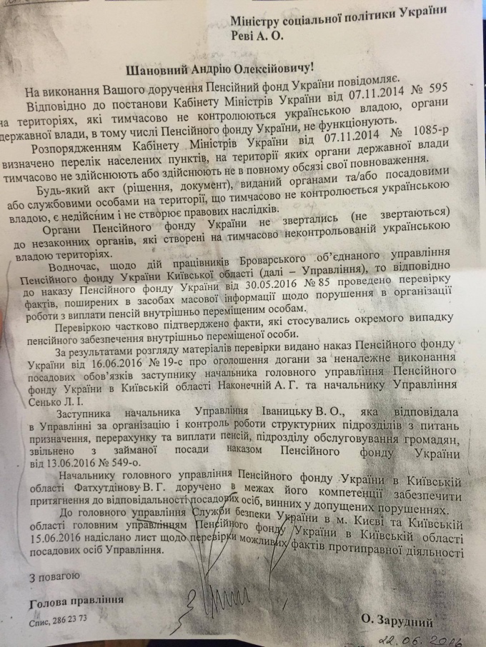 "За результатами перевірки заступник начальника Броварського управління ПФ Іваницька І.О. була звільнена, а начальнику Броварського управління та заступнику начальника головного Управління ПФ в Київській області були оголошені догани", - сказано у повідомленні.