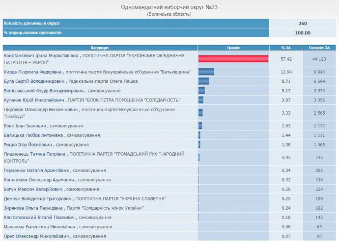 Про це свідчать дані сайту ЦВК після підрахунку 100% протоколів у цьому окрузі.