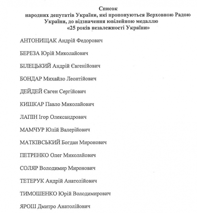 Кабінет міністрів пропонує президентові Петру Порошенко нагородити 14 депутатів Верховної Ради ювілейною медаллю "25 років незалежності України".