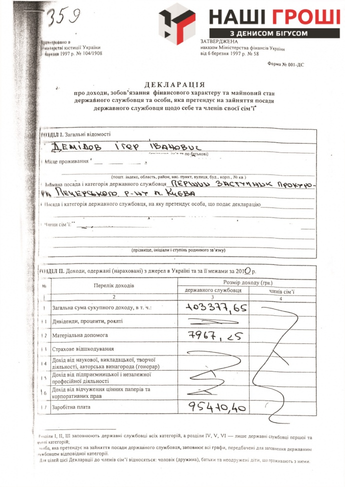 "У 2011 р. Демідов здав декларацію як заступник начальника відділу у ГПУ. У ній вже зазначено будинок дружини, а також дві квартири, три гаражні бокси і два автомобілі - TOYOTA LEXUS ES 350 (2007 р.в.) і LEXUS LX 570 (2010 р.в.). На той час новий LEXUS LX 570 коштував близько 110 тис доларів", - повідомляється у розслідуванні.