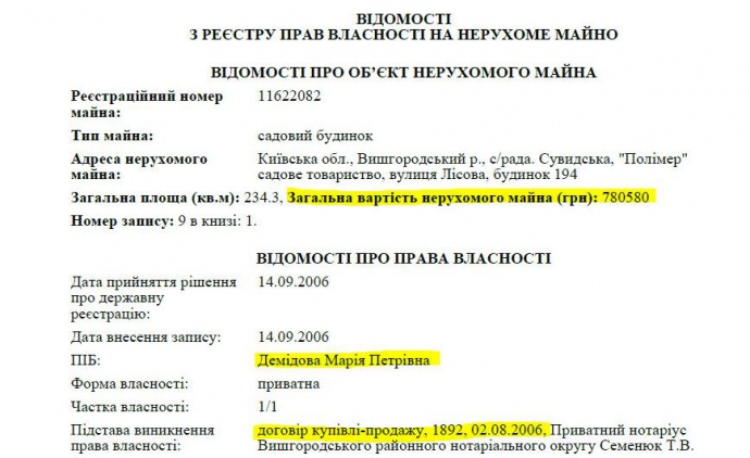 За даними Реєстру майнових прав на нерухоме майно, цей будинок на 230 кв.м. дружина прокурора Марія Демідова придбала у 2006 р. за 780 тисяч гривень.