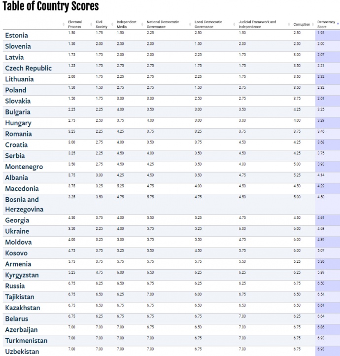 Варто зазначити, що у трійку лідерів рейтингу увійшли Естонія, Словенія та Латвія, які набрали 1,93, 2 та 2,07 бали та визнані країнами зі стійкою демократичною системою, найгірші показники - у країн з авторитарною політичною системою: Росії та країн-колишніх членів СРСР (Таджикістан, Казахстан, Білорусь, Азербайджан, Туркменістан, Узбекістан).