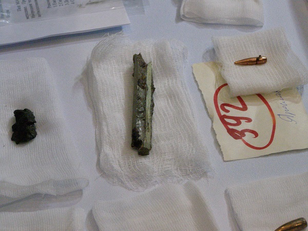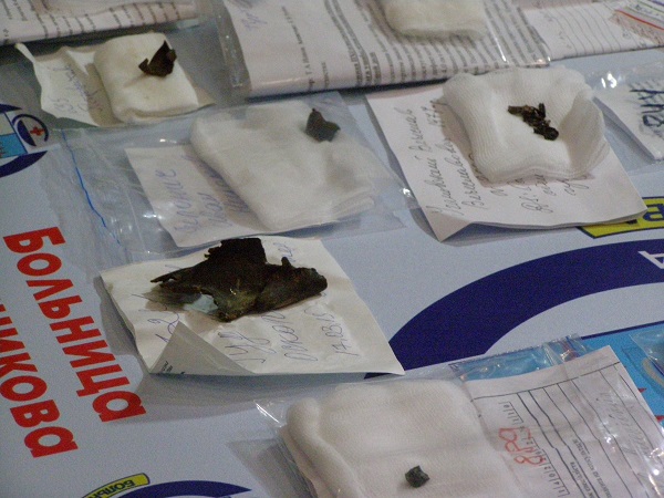 "Тут зібрані кулі і осколки від сучасної зброї, починаючи від стрілецької. Це автоматні кулі, від гвинтівок і ті снаряди, які прилітають на наші позиції і викликають смерті та поранення наших бійців, - зазначив заступник головного лікаря Дніпропетровської обласної кліничної лікарні ім. Мечникова Юрій Скребець. - Тут і товстостінні важкі осколки від артилерії, немагнітні, легкі, але дуже великі - це "Град".