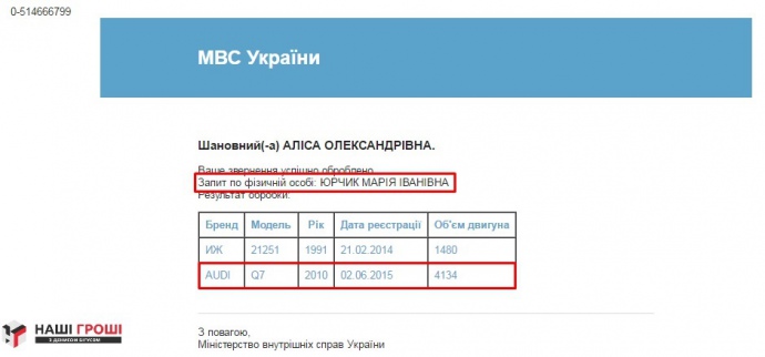 Це засвідчує відповідь з реєстру власників автотранспортних засобів МВС, отримана журналістами програми "Наші гроші".