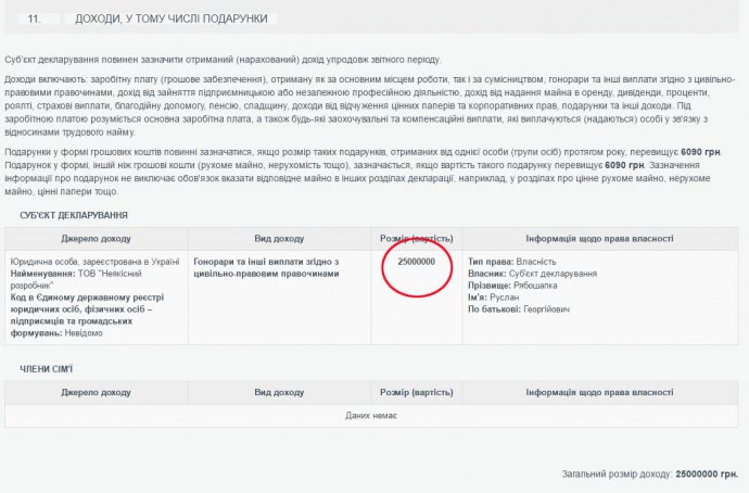 "На сайті з'явилася декларація заповнена невідомими від імені пана Рябошапки, що він отримав 25 мільйонів гривень за 2015 рік від розробника програмного забезпечення. Ми впевнені, що це зробив не він", - сказав Геращенко.