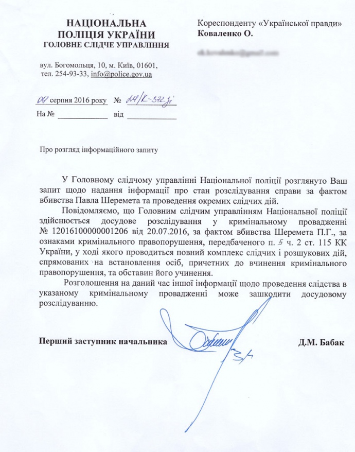 У відповіді лише зазначається, що у ході розслідування вбивства Шеремета "проводиться повний комплекс слідчих і розшукових дій, спрямованих на встановлення осіб, причетних до вчинення кримінального правопорушення".
