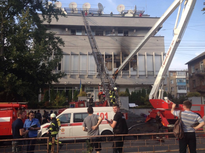 У Києві на вул. Щусєва,26 під будівлею, де розміщується офіс телеканала "Інтер", невідомі підпалили шини, задимлення також було на одному з поверхів у будівлі.