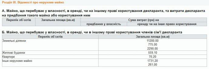 Водночас, його сім’я має в користуванні квартиру площею 70 кв. м, три земельні ділянки (11 200 кв м, 775 кв м і 2 290 кв. м), будинок площею 559 кв. м, а також іншу нерухомість (1731 кв. м і 261 кв. м), характер якої не уточнено.