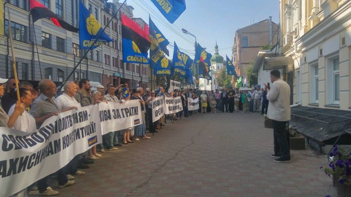 Під судом у вівторок проходив пікет свободівців та їхніх прихильників. Серед них були присутні лідер партії Олег Тягнибок, екс-міністр АПК Ігор Швайка та інші.