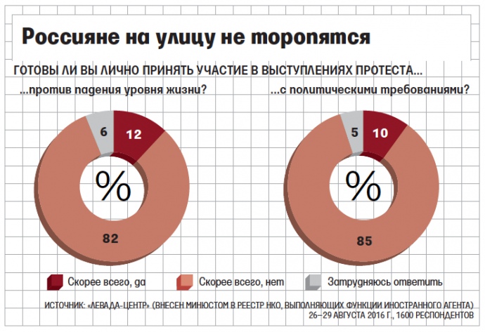 Тільки 18% опитаних бачать можливість масових акцій проти падіння рівня життя і 15% допускають протести з політичними вимогами. Особисто брати участь в протестах готові тільки 10% росіян.