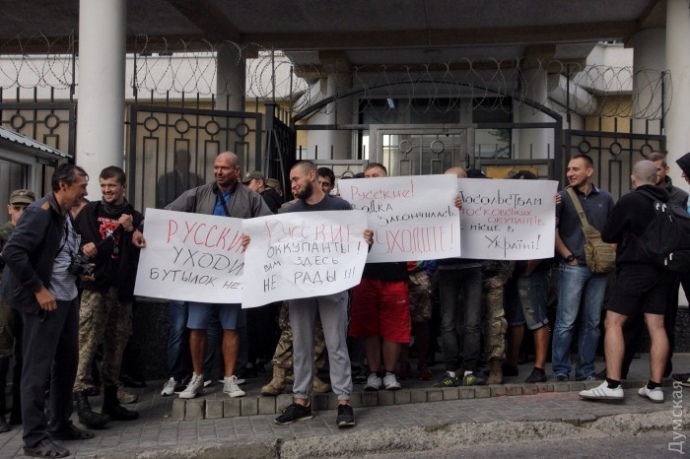 Близько 20 осіб стояли біля входу з плакатами "Росіяни, горілка закінчилася. Йдіть геть!", "Окупантам тут не раді" та інше.