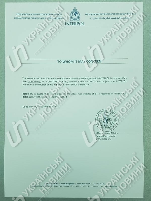 "Є призупинені "червоні повідомлення". А от остаточних рішень немає. Офіційно Україна визнала факт рішення секретаріату Інтерполу в Ліоні про відмову в проведенні пошукових заходів у відношенні Богатирьової Раїси Василівни. У мене на руках є відповідь Українського бюро Інтерполу, який документально підтверджує цей доконаний факт", – каже Бєляєв.