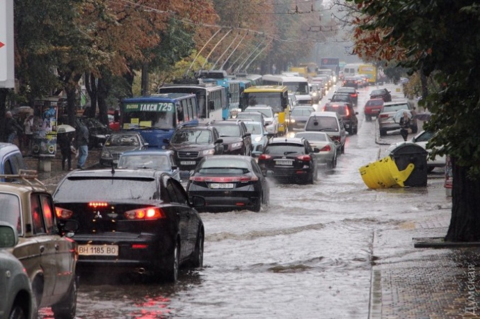 Одесу у вівторок заливає дощем – у місті потоп і затори, рух деяких трамваїв призупинено, частина міста залишилася без електрики.