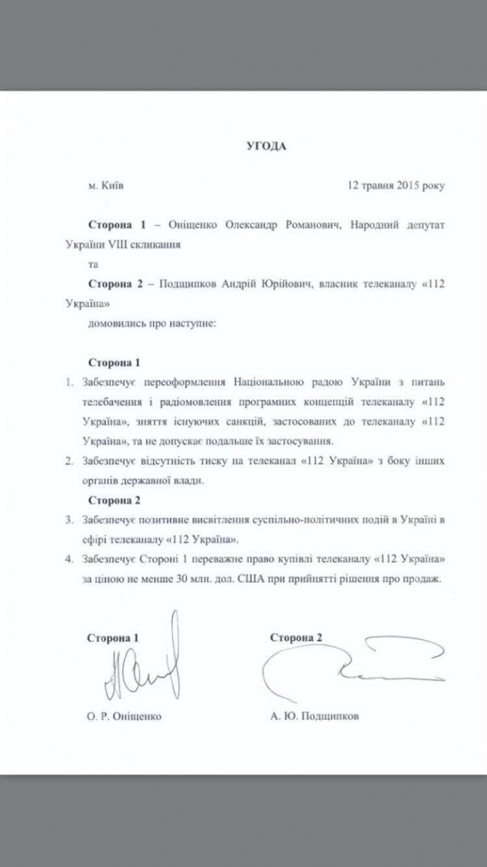 Онищенко стверджує, що поки тривали переговори про купівлю-продаж Порошенко запропонував підписати меморандум – угоду про наміри, що припускає пом'якшення інформаційної політики каналу по відношенню до президента - в обмін на допомогу в переоформлення ліцензій телеканалу і зняття з нього санкцій Нацради з телебачення і радіомовлення.