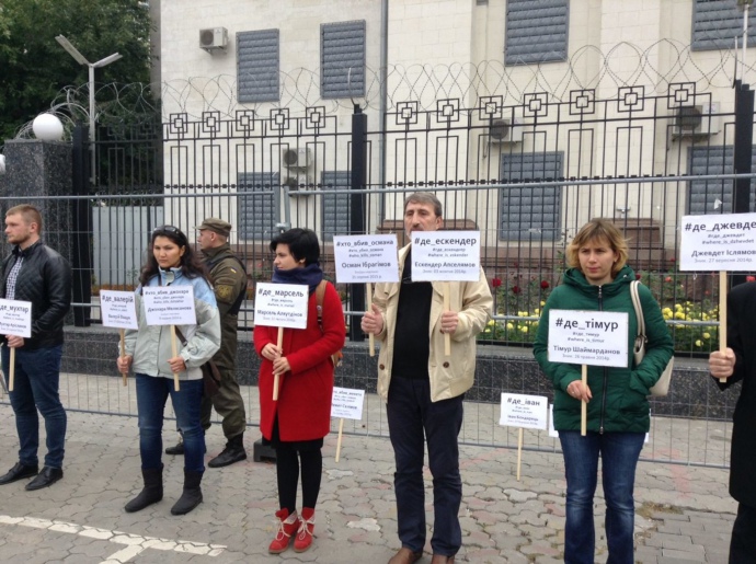 Близько 15 демонстрантів у Києві під посольством Росії вимагають розслідування викрадених та вбитих людей у анексованому Росією Криму.