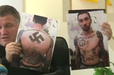 Міністр також показав фото одного з затриманих, який, за його словами, є громадянином Росії і приїхав в Україну, де останні два роки займається "такою вільною діяльністю". На фото видно, що затриманий має на спині велике татуювання у вигляді свастики.