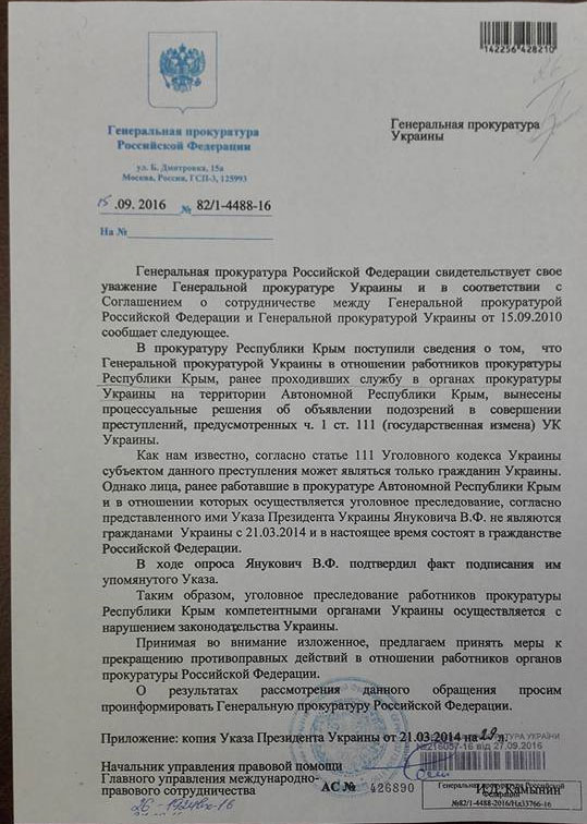 "Вчора отримав листа від російського ГП. Дуже стурбовані нашим кримінальним переслідуванням за державну зраду прокурорів АР Крим. Доводять до мого відома, що в березні 2014 у м. Ростов-на-Дону Янукович підписав Указ про вихід з громадянства Україна 590 осіб прокурорського складу", - розповів він.