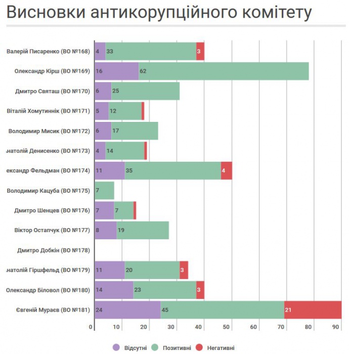 Громадянська мережа проаналізувала наявні на сайті ВР висновки антикорупційного комітету щодо законопроектів харківських "мажоритарників" і виявила, що найбільшу кількість законопроектів із корупційним ризиком зареєстрував нардеп Євгеній Мураєв – 21.
