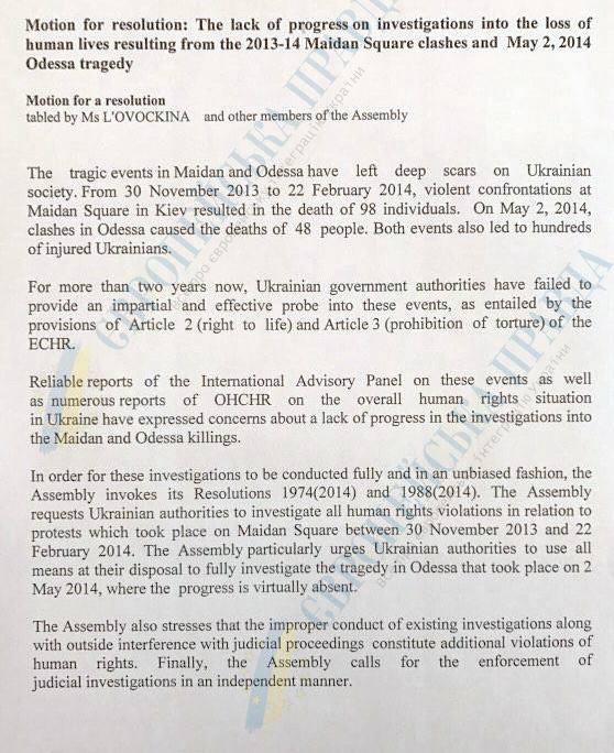 Пропонується спрямувати до Києва офіційний заклик асамблеї щодо розслідування подій на Майдані та в Одесі, щоби "примусити" Україну використати всі наявні механізми для такого розслідування.