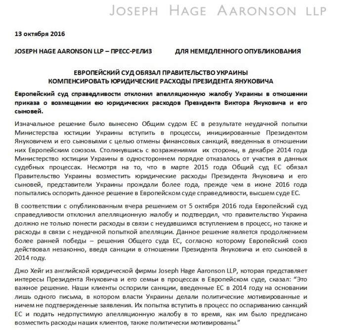 "Незважаючи на те, що в березні 2015 року Загальний суд ЄС зобов'язав Уряд України відшкодувати судові витрати Президента Януковича і його синів, представники України прочекали більше року, перш ніж в червні 2016 року спробували оскаржити дане рішення в Європейському суді справедливості, вищому суді ЄС", - йдеться у прес-релізі.